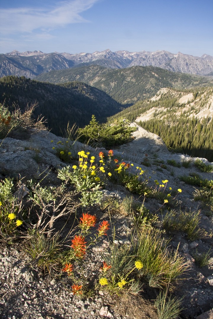 The Waipiti Creek Trail lies just outside the northwest corner of the Sawtooth Wilderness. The trail climbs more than 3,000 feet to reach Point 8,836, where an 180-degree panorama takes in the entire west side of the range from Mount Zumwalt to Nahneke Peak on the south end of the range. The there-and-back trip to Point 8,836 is a big day hike (8.8 miles and 3,470 feet of climbing), but it is well worth the unique perspective on the range. The wildflowers on the south slopes and along the ridge are also quite stunning. There is no water available on the hike, but snowdrifts up high can last into the middle of July.