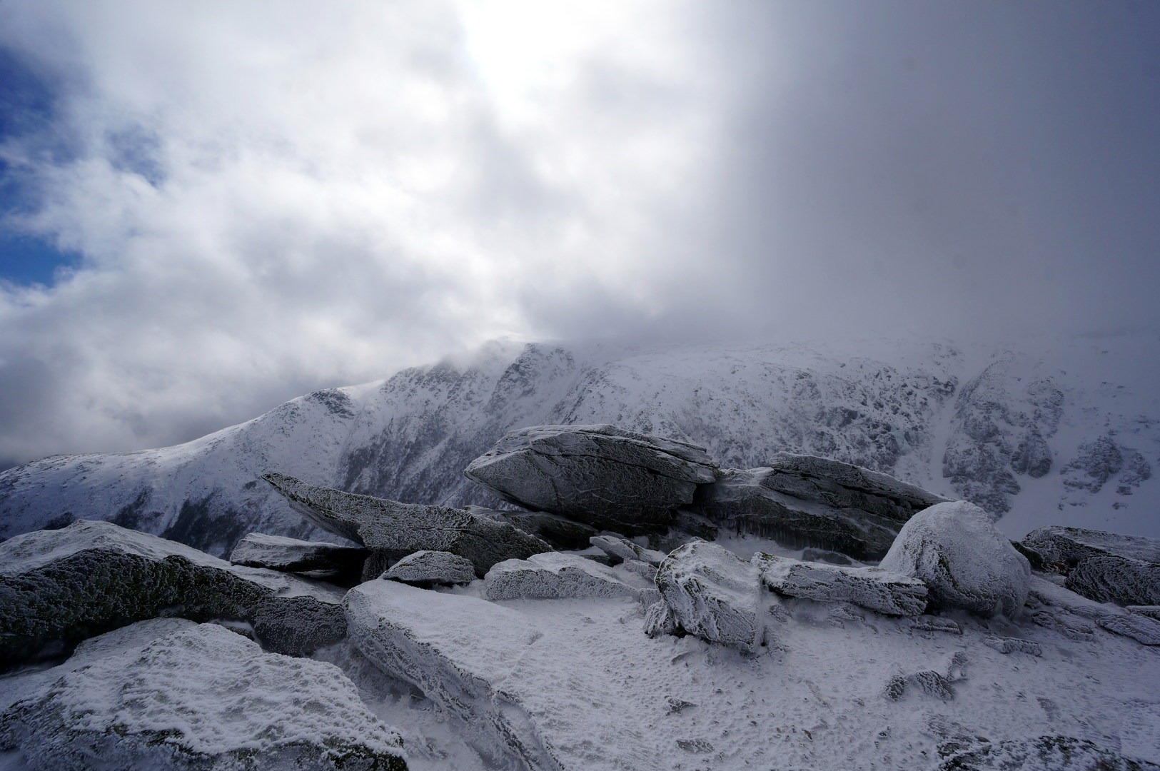 Before emerging from the trees assess whether you need to put on your outer shell, balaclava and goggles before continuing up the exposed, rocky and often icy trail. It is common for fierce winds to rage along this section, especially from the Lion Head Knob, a rock formation at about 5,000 feet, to just past the intersection with the Alpine Garden Trail. Be aware that you will be traversing the rim of Tuckerman Ravine once past the Lion Head formation. People have been blown into the ravine to their death. After a total of 2.6 miles, the Lion Head Trail rejoins Tuckerman Ravine Trail.