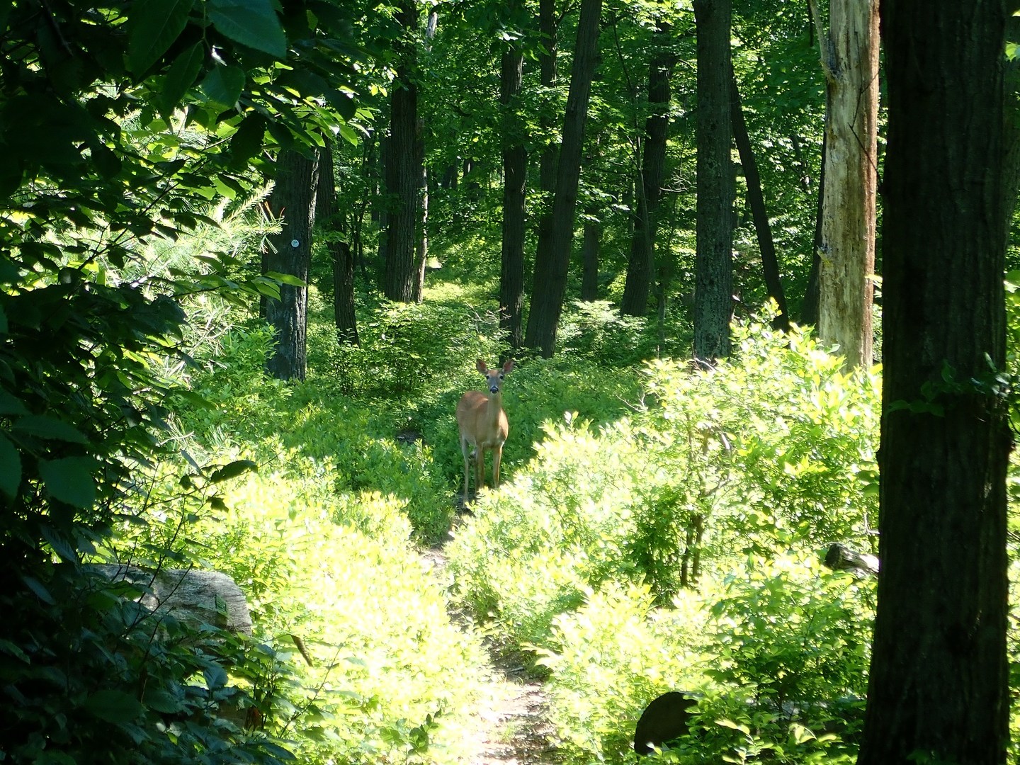 After the 1.5 miles you reach the Palisades Interstate Parkway. Cars drive fast here so be careful crossing the road. Turn right at the south bound lane to cross and back right after crossing. The trail enters the forest on the right. Another 1.8 miles of shaded trail leads to Seven Lakes Drive and the Long Mountain traffic circle. Turn right on the road and stay left at the traffic circle. Walk left on Route 6 and walk down a side road until the trail enters the forest on the left. After 1.2 miles, the trail reaches another forest road and follows for a short distance. Watch for the trail on the left. If you stay on the forest road too long you will end up on West Point property. The trail borders the military academy for 1 mile until you reach the Popolopen Stream.  Cross the stream and follow about 1 mile where the trail exits onto a road. Turn right and follow until the trail re-enters the forest on the left. Another half mile and you will reach the visitor center parking lot.