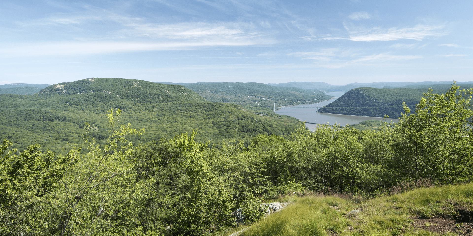Climbing higher, you will get your first glimpse of Perkins Memorial Tower at the summit of Bear Mountain to the north. As the path begins to level off, the Cornell-Mine Trail ends and intersects the red-blazed Ramapo-Dunderberg Trail. Take a right onto this path and circumnavigate to the 1,130-foot summit of Bald Mountain. This high region of the Hudson Valley has scattered tree cover surrounded by lush grasses and beautiful mountain laurel which bloom in late June. With its sparsely wooded peak and rock ledges, Bald Mountain offers fantastic views of the surrounding area: To the west you can see the 1,080-foot summit of the Timp, which lies on the border of Harriman State Park; to the north, you may be able to see visitors at the top of Bear Mountain checking out the tower and enjoying views that stretch to the Manhattan skyline over 50 miles to the south. The valley between Bald Mountain and Bear Mountain is home to the ghost town called Doodletown: a small, isolated community settled in the 1760s by loggers and miners that had residents until 1965 and has old foundations and cemeteries that can still be explored. The Bear Mountain Bridge spans the Hudson River to the north with Anthony’s Nose at its eastern end. The scene continues up to the West Point Military Academy and the bend in the river around Constitution Island. From here you can descend Bald Mountain on the same path, continue on this path down to the 1777 trail for a longer loop through Doodletown, or continue to the east over Dunderberg Mountain to Jones Point and the foundations of an old railroad bed that was never completed. Refer back to the park’s map for additional route information.