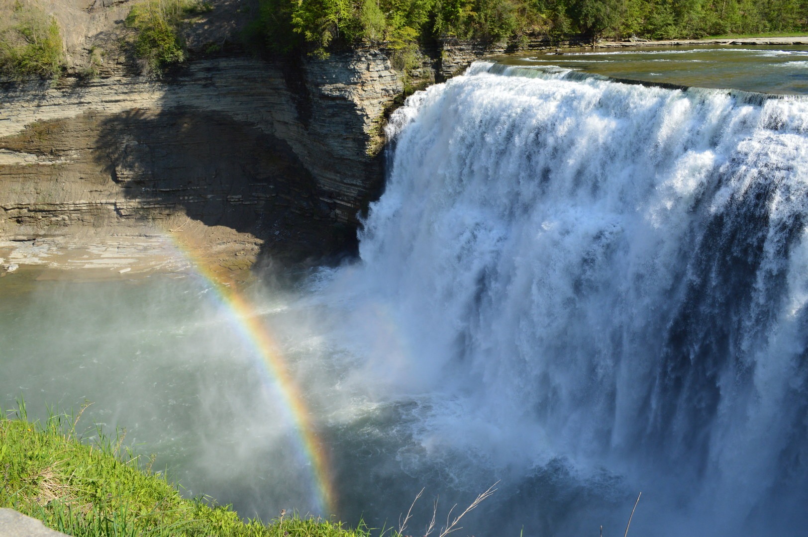 The trail continues along the edge of the parking lot past a bathroom building and picnic areas to the Middle Falls. The largest of the three waterfalls, it drops 107 feet into the river below. If you visit on a sunny day, be sure to pause and look at the gorge bend to the left of the falls, where rainbows in the mist are a constant delight.
