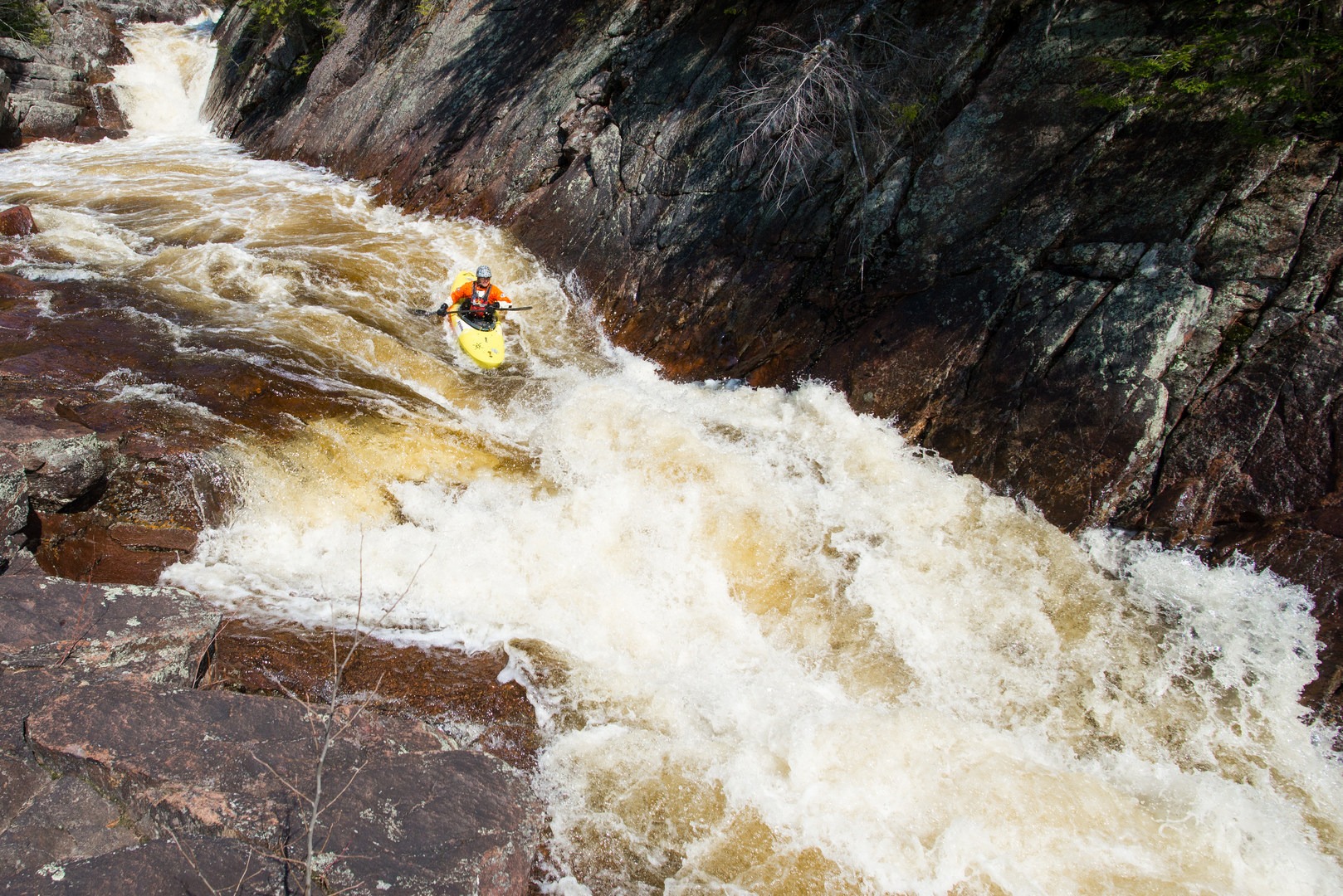 Sluice Falls (Class V+) is a fascinating spectacle of whitewater. The entire river makes a 110-degree turn to the left, pillowing up against bare bedrock walls and funneling down into a crack barely 6 feet wide. Just downstream it pinches up again, creating a vague replica. The folding currents are intimidating to say the least, and they offer enough challenge to keep even the best paddlers on their toes.