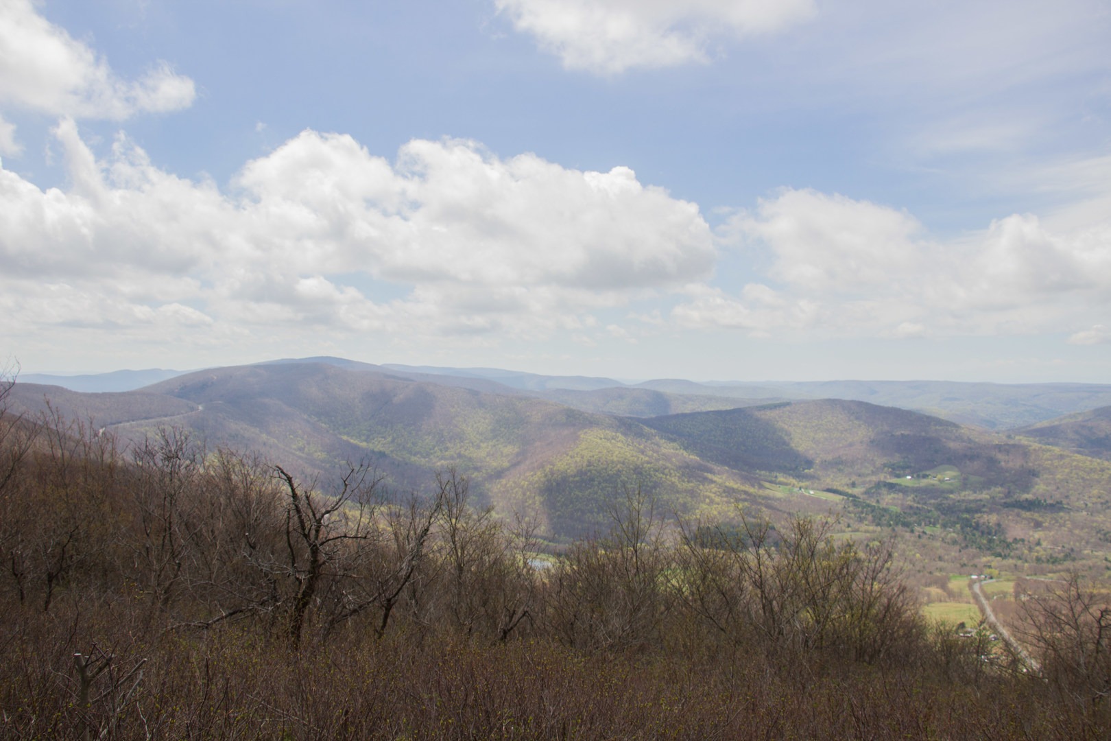 The trail begins across from the Petersburg Pass parking lot. The trailhead from this parking lot is hard to see. The first section of the trail is very steep and leads to a board with maps and the registration box. Just past the registration box is a path to the first viewpoint, where a small wooden bench looks out over the valleys. The trail continues to climb but stays just below the ridgeline. The trail can get muddy during the spring season but dries up in the summer when more crowds arrive.