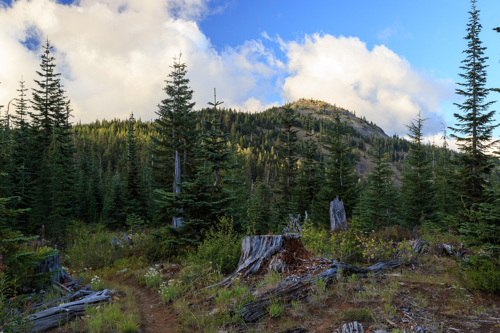The trailhead lies unmarked at the end of a forest road in the shadow of nearby Coffin Mountain and its actively staffed lookout (viewable from the trailhead). Given the drive up, it may be worth combining these two hikes; they are very similar in terms of distance and elevation gain.