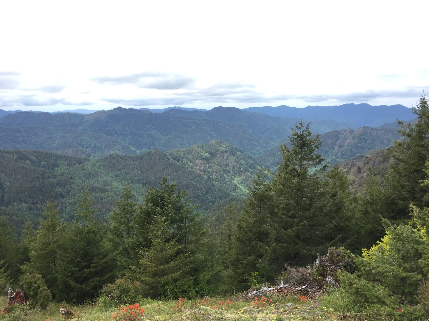 Entering the trail you will hike through a harvested forest with plenty of regeneration, a clear sign of replanting efforts after logging operations. The buzz of horseflies, honey bees, and many other insects is the only thing that you will hear while hiking up this trail. The first half-mile of trail is relatively flat. Once you enter the single canopy forest, the trail begins a series of steep, short switchbacks. The trail surface transforms eventually from soft dirt to loose rock, so a sure foot and good traction is recommended. As you near the top there are numerous ridges to explore only a few feet off the trail. There is no evidence of other hikers making trails, so moving through the brush to get a clear view can be difficult in a few places, but it is worth the effort.