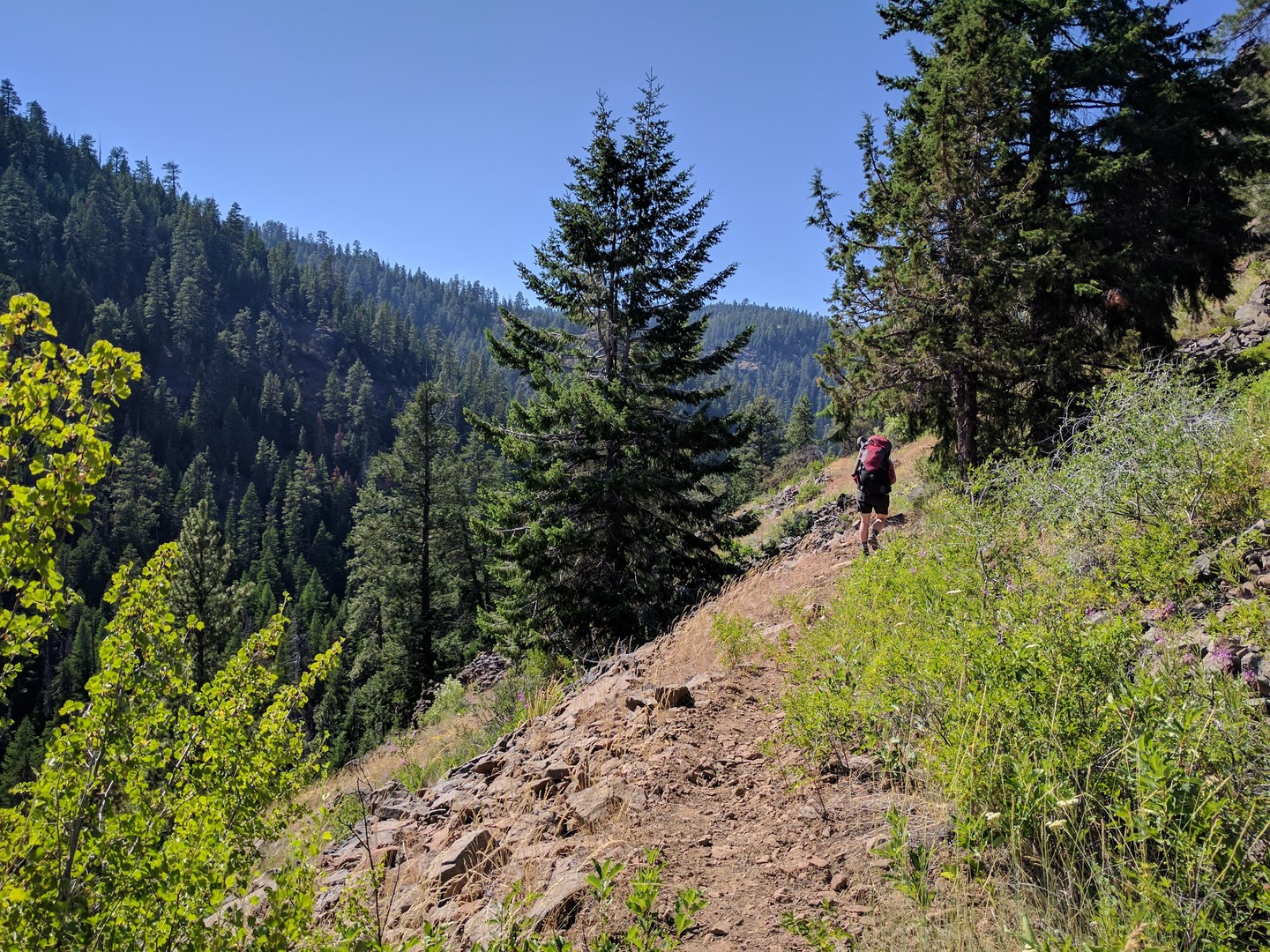 Another 2 miles and some steep descents will bring you to Buck Creek, the first water source since leaving First Creek in the Rock Creek drainage. There are intermittent views of the Black Canyon along these 2 miles and an overall increase in disturbance from cows grazing on public lands. Continue to gradually descend another 2.5 miles to Cottonwood Creek. The scenery changes from scablands to forest as you proceed along cottonwood drainage. You climb from here 1 mile up the trail before you cross Tin Cup Spring/Creek. Here you will see an old dispersed campsite adjacent to the trail with an overgrown fire ring. It makes for a nice camp after a very, very long day.