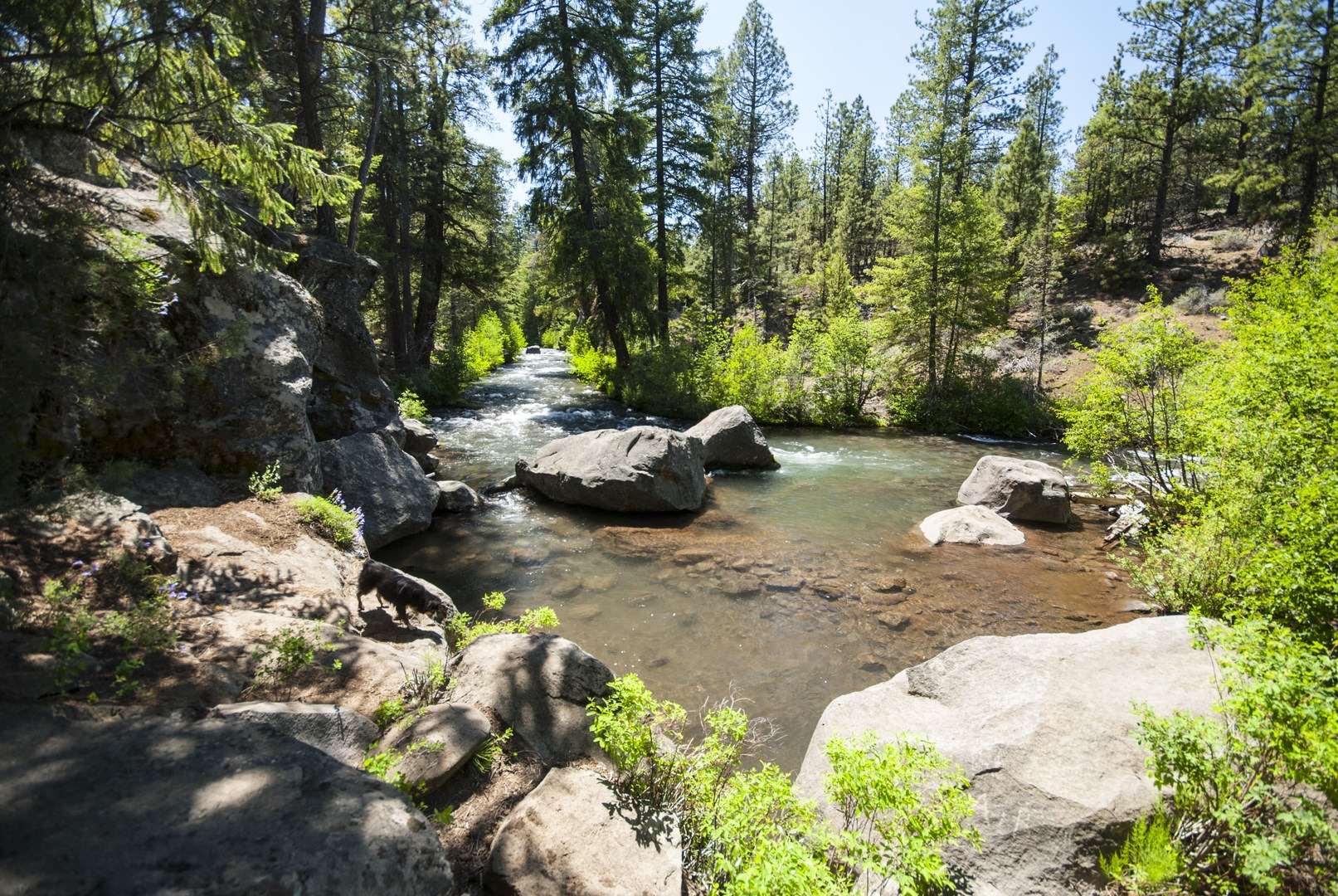 The trail winds through intermittent canopies of ponderosa pine, Engelmann spruce, white fir, and Douglas fir, and hikers will enjoy constant views of the mellow river, deep eddies perfect for swimming or letting the dog cool off, numerous wildflowers, and massive house-sized boulders. In total the trail runs roughly 2.75 miles upstream from the parking area to its intersection with the Metolius-Windigo Trail, but a bluff 1.6 miles upstream with views of Broken Top and the Three Sisters makes for an excellent spot to turn around.