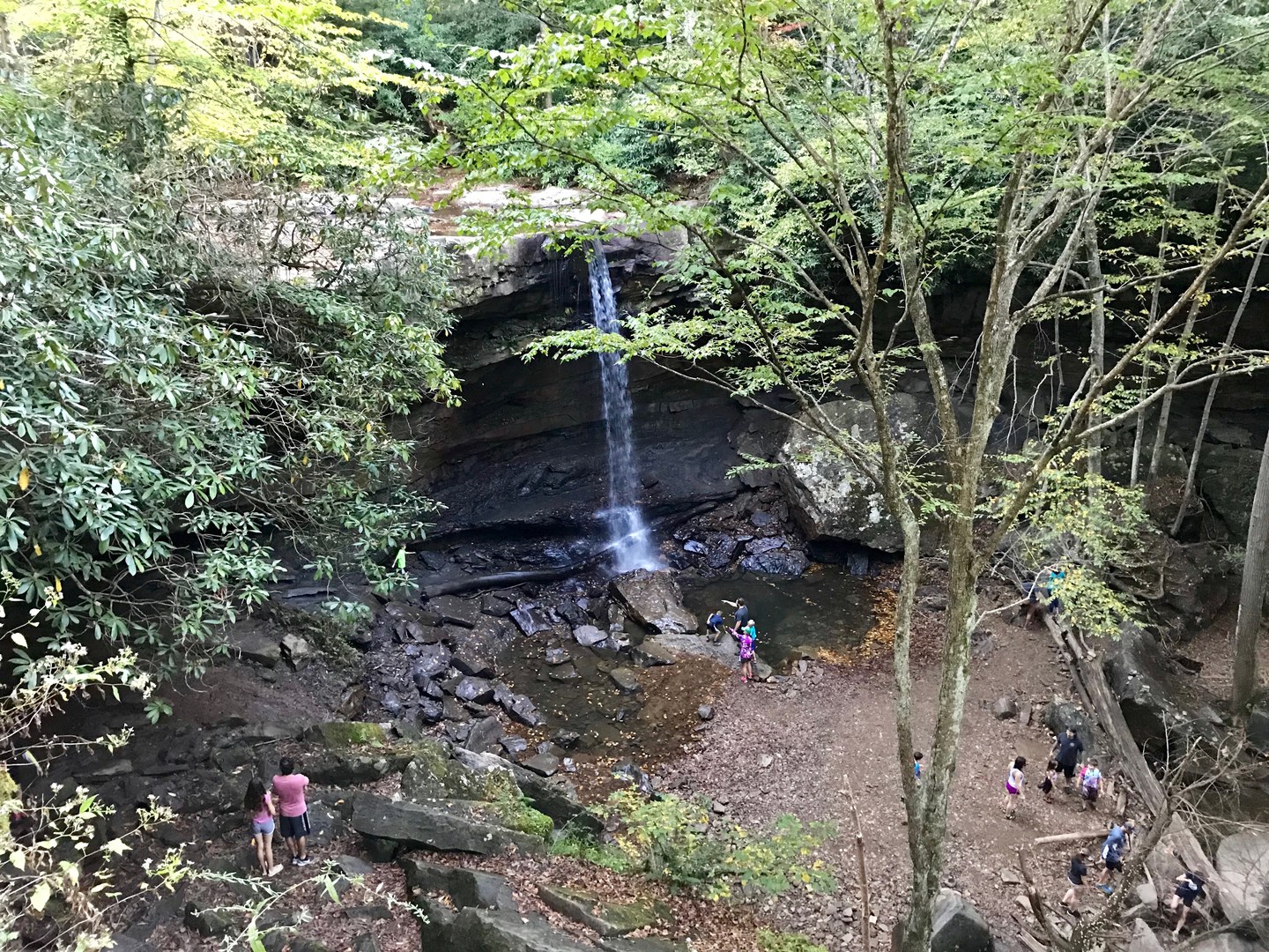 Ohiopyle State Park is located along the Youghiogheny River, and its geology is similar to other areas within the Appalachian Mountains. According to the Pennsylvania Department of Conservation and Natural Resources, "Cucumber Falls plunges about 30 feet over a resistant lip of coarse-grained sandstone of the Alleghany Formation. The lower portion of Cucumber Falls is made up of softer, finer grained rocks, which makes them erode much more quickly."  Even though Cucumber Falls' low volume in the late summer makes for a less than impressive water fall, the ability to explore so much of the area below the falls makes it completely worth a late season trip. The water cutting into the rocks makes for interesting scenery with almost a spooky feel.