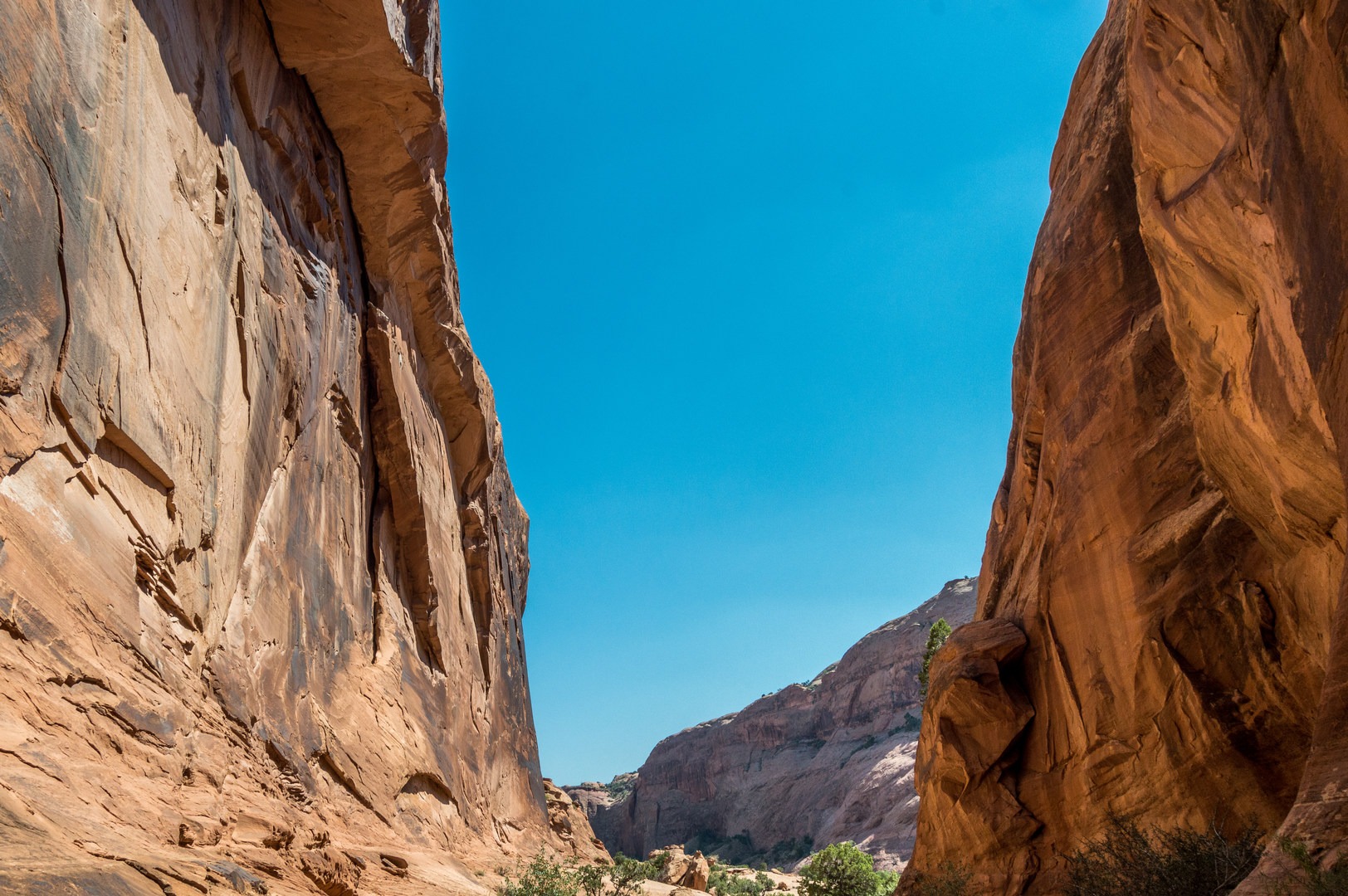Begin from the start of Fins N Things Jeep Trail, 2 miles past the entrance station in campground Loop E. If the campsites here are full, you may have to park elsewhere and walk back along the road. Follow the jeep track for half a mile until you come to a left-hand bend at a large, dead juniper tree. At this spot, turn right off the jeep track into a shallow wash. You are now hiking cross-country, so be sure to stay in the wash or on worn paths to avoid trampling the fragile desert ecosystem. Follow the contour of the wash as feeds into a canyon between rock fins. This is a narrowing and deepening slot that you must descend with a little bit of boulder scrambling and bushwacking. The view from here is impressive as you look straight off the edge of the plateau and across to the La Sal Mountains. This is the last vantage point you will get before disappearing into the slot canyon narrows.