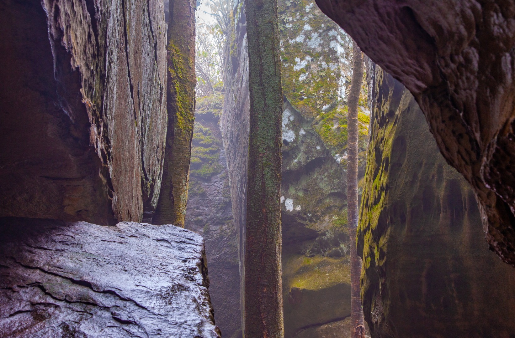 Slot canyons on the East Coast? Yes! There really are slot canyons tucked way into the corner of southwest Virginia in the 4,836-acre Channels State Forest. It’s a maze of sandstone slot canyons that you can get lost in while trying to figure out how they got here on top of a mountain. The slots are between 20 to 40 feet deep. Some short sections of the slots are narrow enough to force you to shimmy sideways to get through. Others are wide. In some areas you have to duck. This is a compact but fun area to explore.