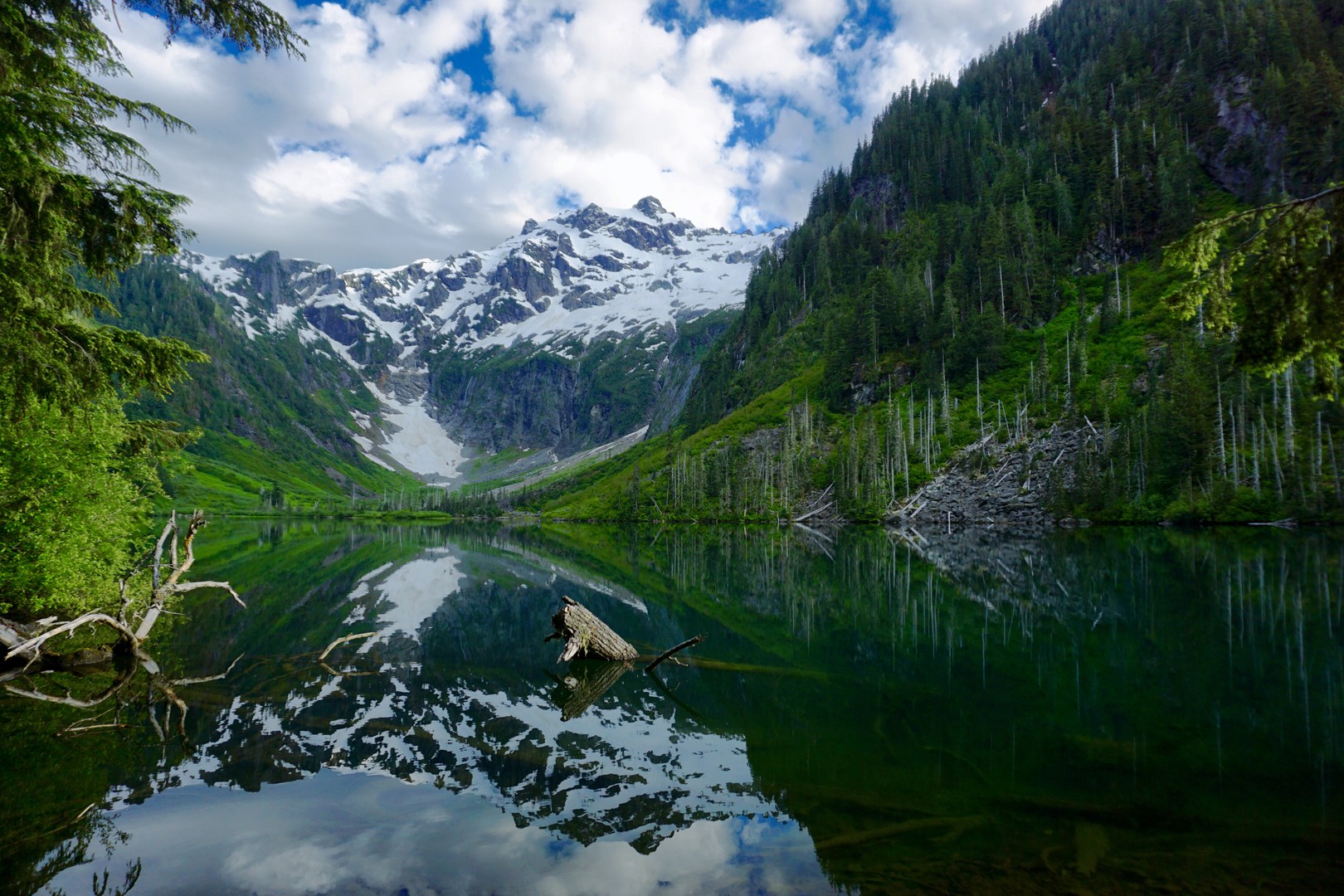 The trails will come back together in about 2.5 miles, and from there the incline slightly increases and the switchbacks start. There are occasional views of Elliot Creek and a large waterfall. Once at the top, the campsites are on the left and clearly marked along with a toilet that is completely in the open. Once past the campsite, the trail continues down to the lake where most people stop. There are even better views farther along the lake, however. The trial narrows and is sometimes overgrown with fallen trees, but it is well worth the extra few minutes. On a still day the lake can show an excellent reflection of part of Monte Cristo Peak, which was named after the old mining town that used to be around that area.