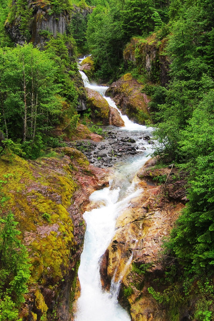 Losing elevation at a gradual pace, the main Lava Canyon trail continues east into the canyon along the river. Although this trail won’t provide grand views to the distant mountain peaks, it will provide countless overlooks to waterfalls carved into the landscape created by past volcanic activity. The trail below the waterfall viewpoint becomes more difficult because it is no longer paved and follows the cliff-lined canyon walls. The exposure in this lower area can be intense at times, and hikers of all skill levels should proceed with caution due to the loose rocks on the trail.
