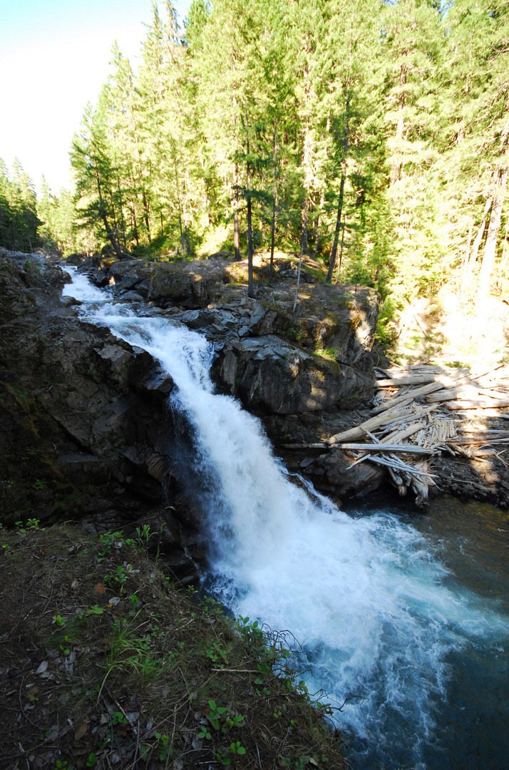 One can view the falls and the Ohanapecosh River Gorge by accessing either the Eastside Trail from Stevens Canyon Road at the trailhead for Grove of the Patriarchs (1.4 miles total) or by departing from Ohanapecosh Campground (3.4 miles total).  Either way, the hike through the dense Pacific Northwest conifer forest along the river is truly magical. If you depart from the campground you'll pass by Ohanapecosh Hot Springs, a modest thermal spring that creates a thick, mineral rich, grassy meadow.