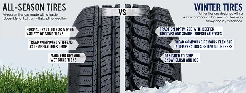 Snow tires, designed for cold-weather traction, are crafted to handle snowy and icy surfaces far better.
